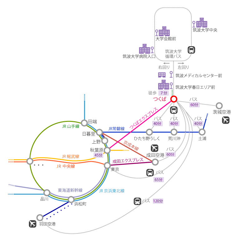 - 東口1乗り場から「つくばセンター」行バスで35分、 つくばセンター6番乗り場で「筑波大学循環(右回り/左回り)」に乗り換え15-20分