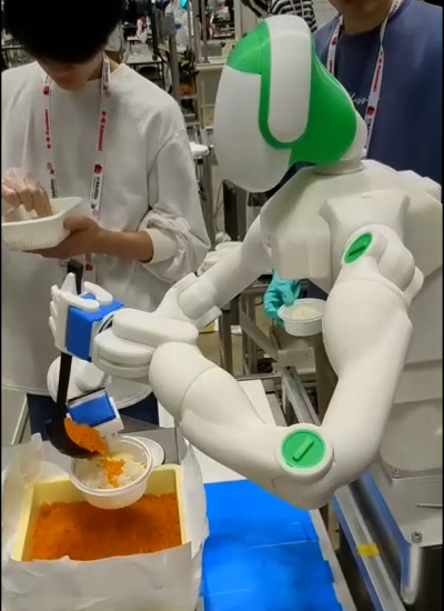 As one step towards this goal, we participated in the “Food Topping Challenge” in May 2024 at the IEEE RAS international conference ICRA 2024 in Yokohama, where we won first place. In this event, an existing robot was trained to learn the sequence of movements and force adjustments required to lift a bowl from the table with its right hand, scoop salmon roe with a ladle in its left hand, place the roe into the bowl, and return the bowl to the table. The process was executed smoothly (Figure 2). Experts in AI robotics were surprised because only two days before the competition, we updated the command data on-site by having a human demonstrate the task through bilateral control. In contrast, conventional AI robot training typically involves collecting data over weeks or months, training AI with these data, and bringing carefully preprogrammed command data to the venue.