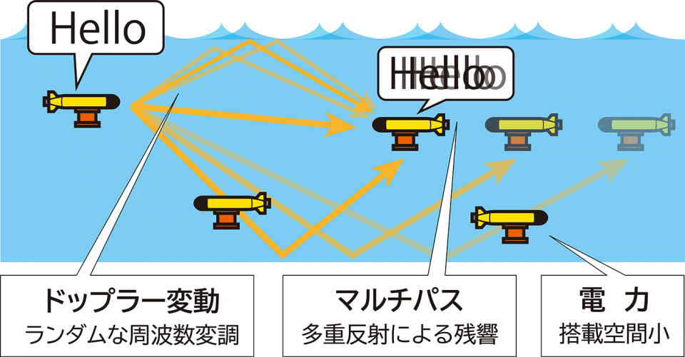陸上の無線通信に用いられる電波や光は、水中では遠くまで届きにくいので、長距離の通信にはあまり適していません。一方、音波は水中でも遠くまで届くので、水中無線通信の媒体として有望です。しかし、音波の伝搬速度が電波や光に比べて極めて遅い点が課題になります。