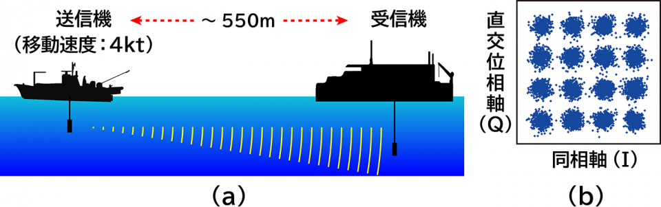 図2:実海域での移動体通信実験 (提供:筑波大学通信システム(海老原)研究室) 送信機を計測船に、受信機をバージに搭載し、送信機を移動させながら連続的に信号を受信機に伝送した (a)。受信した信号を解析したところ、受信信号の振幅-位相分布のばらつきが雑音レベルに収束しており、移動しつつ良好な通信品質が達成できることが確認できた(b)。
